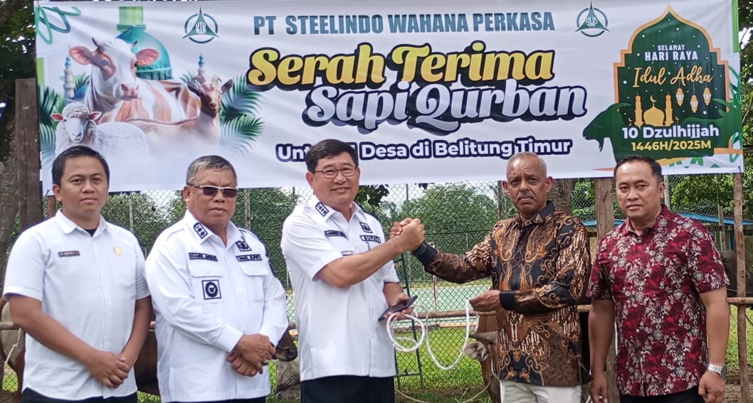 Koran-beritaindonesia.online | BELTIM – PT Steelindo Wahana Perkasa menggelar kegiatan Serah Terima Sapi Qurban ke 11 Desa yang masuk wilayah kerja perusahaan di halaman Kantor PT SWP., secara simbolis diserahkan langsung oleh President Directur KLK Region Belitung Kanapathi Rao A. Natchana, Rabu (4/6/2025).