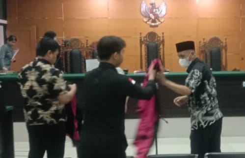 Pada saat datang dan keluar ruang sidang utama PN Serang, mereka mengenakan rompi khas Kejaksaan Agung, warna merah jambu dengan kedua tangan diborgol.
